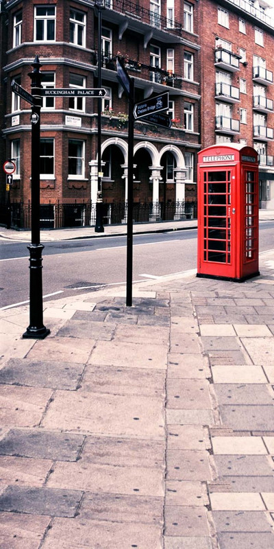 British Phone Booth depicts a black and white scene of a London street punctuated by one of the famous bright red phone booths. The road sweeps into the floor portion of this exterior backdrop.