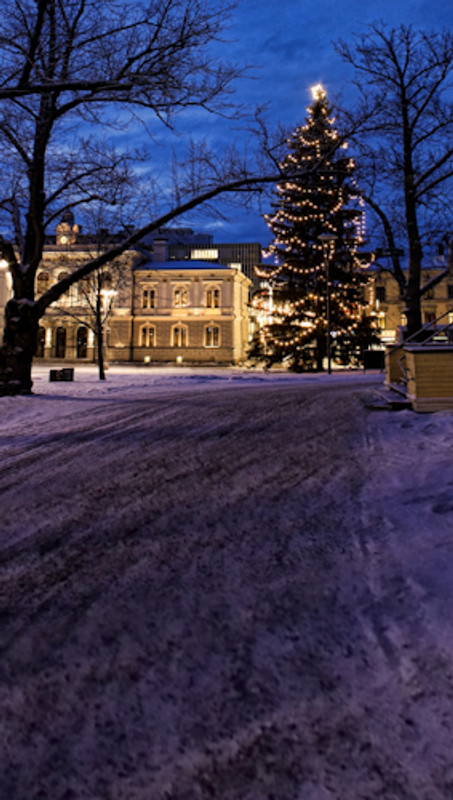 A snowy driveway leads up to a brightly lit manor house with a giant pine tree decorated with classy strings of white Christmas lights outside.
