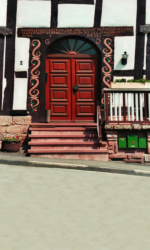 Double Red Doors is a charming exterior image of two cheery red doors surrounded by a detailed frame. Above the door is a fan-shaped transom. The front porch steps down to a slanted road which becomes the floor sweep portion of the backdrop.